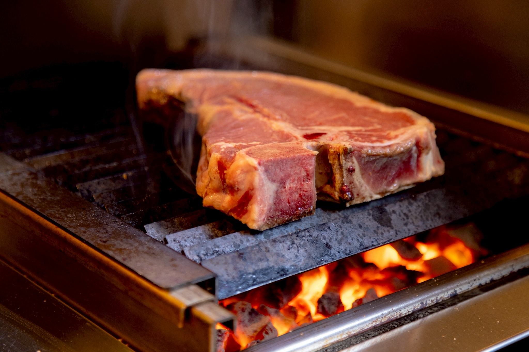 店内に入ると、ずらりと並んだワインがお客様を出迎えます。外の喧噪を忘れさせる、少しレトロで別世界のような空間でお食事をお楽しみいただけます。全席にてカウンターの鉄板焼きを用意しており、専属のシェフが目の前で調理いたします。コースメニューは各種ご用意しておりますが、もしお好きに注文したい場合は、アラカルトでもお楽しみいただけます。ステーキは最上級ランクの特選黒毛和牛を使用しており、美味しい肉を極限までこだわった最高の調理方法でご提供いたします。