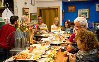 大皿に盛られたタパスやピンチョスがぎっしり並ぶカウンターは、サンセバスチャンのバルの風物詩。あれも食べたい、これも食べたい!と悩みは尽きない。 -