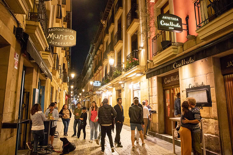 朝は、タパスをつまみながらのんびり軽口をたたき合うシニアたち。昼は、働者と観光客がひっきりなしに出入りして大賑わい。そしてバルが最も盛り上がる夜。通りにはバルホッピングを楽しむ人々が行き来し、調べておいたお目当ての店や、賑わいに惹かれて飛び込んだり。カウンターで立ち食いが基本のバル。居合わせた人々と、食いしん坊話題が始まるのもお約束。ここが最後の一軒、と決めていたのに、聞くからに美味しそうなバルが気になり、ついついホッピング続行。こうして、サンセバスチャンの夜は更けてゆく。