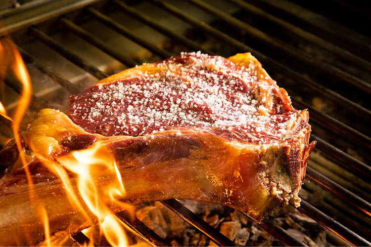 フランス・ゲランド産の海塩をたっぷり振って焼くガリシア牛。落ちた脂の香りは炎を介して再び肉に戻る。 -