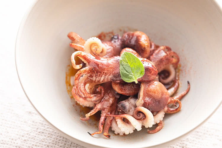 地中海沿岸パラモスで揚がる、指先ほどの小さなタコ。フライパン型の網にのせて、熾火で優しく加熱。 -