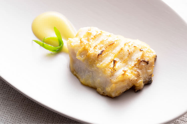 バスク地方名物『ココチャ』も、独創的。チタン製網を使い、熾火で“揚げ焼き”を実現。バスク伝統のピルピールソースを添えて。