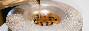 続いて運ばれたスープも圧巻。皿には、ネギの輪切りのように見える大根のリングの中に、卵黄、空豆、黒キクラゲが詰められて、バルサミコ酢のキャビアと一緒に、花のように並べられている。サーバーが、白胡椒と花山椒の風味が染みこんだスープを注ぎ込んだ後、緑のネギ油と赤いチリ油を振りかけ、水玉模様を描いた。