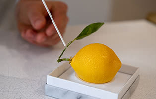 セドリックの名前を世界に広めた“フルーツ”シリーズの定番、『レモン』。本物かとみまごう精巧な作り。ブティックでは、オリジナルの美しいボックスに入れて販売。 -