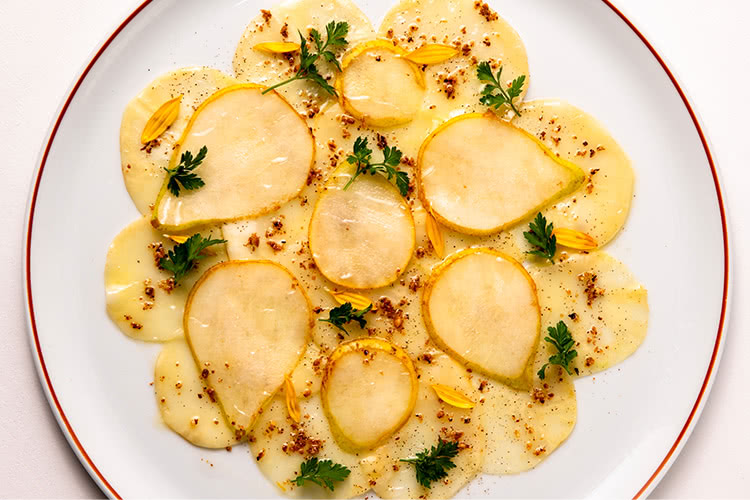 薄切りの根セロリをバターで優しくコンフィ。上に洋ナシのスライスを重ね、グリルして砕いたノワゼットを散らす。同系色の野菜や果物をとり合わせるのは、パサール氏の好み 母は洋裁師、父は音楽家、祖父はかご作り職人。芸術家と職人が織りなすアーティスティックな環境は、パサール氏に、自然と、色彩や詩情といった美に対する感性を植え付けていたのだ。