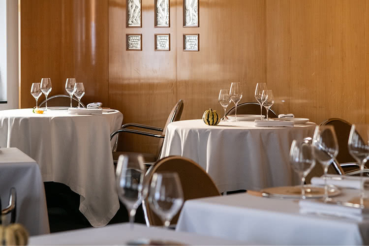 こぢんまりとした客席は、木のぬくもりとラリックのクリスタルの輝きに包まれる。テーブルのオブジェは、届いたばかりのみずみずしい野菜たち 今でこそ、世界的に健康志向が広がり、野菜料理への注目度は高い。が、当時、ガストロノミーで野菜を主役にした料理人は、文字通り皆無。今をときめく3ツ星シェフが、フランス料理の華である肉を捨てて付け合わせにすぎない野菜を選んだ! と、当時は大きな批判もあった。