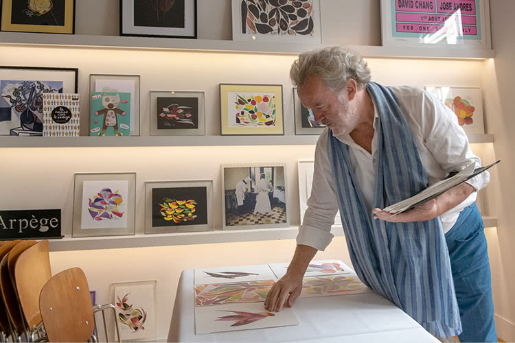 パサール氏の創造力は料理を超える。数年前から、自らの料理作品を、雑誌などのページを切り抜いてコラージュ作品に仕立てている。店のそばのオフィス内にギャラリーを作り、展示販売している